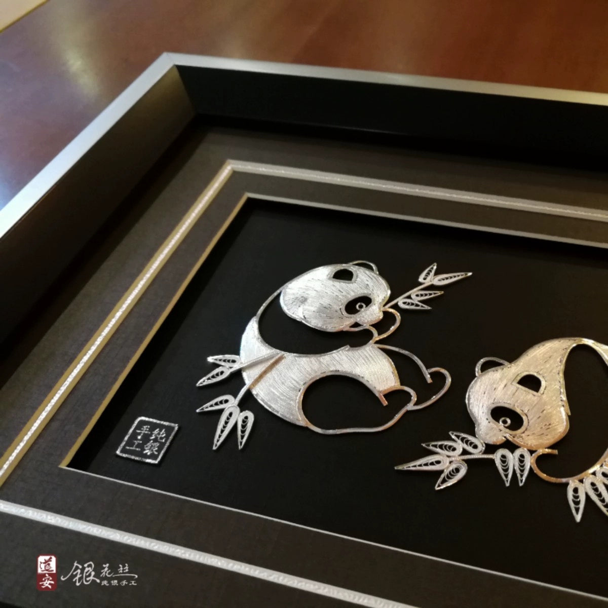 Pandas are a symbol of China, representing peace and friendship. This silver silk painting is a perfect gift for foreigners, carrying the unique culture of Sichuan. It can not only be used to decorate living rooms and study rooms, adding a touch of artistic atmosphere, but also has high artistic and collection value.