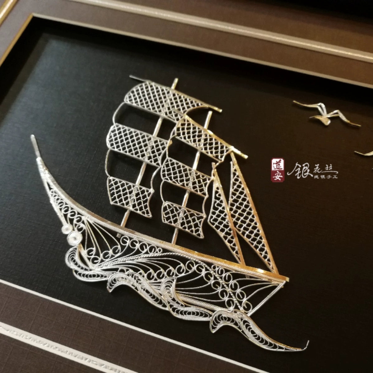 Handmade Silver Silk Painting of a Sailboat – Traditional Chinese Chengdu Daoan Silver Filament Craft | Cultural Heritage Art