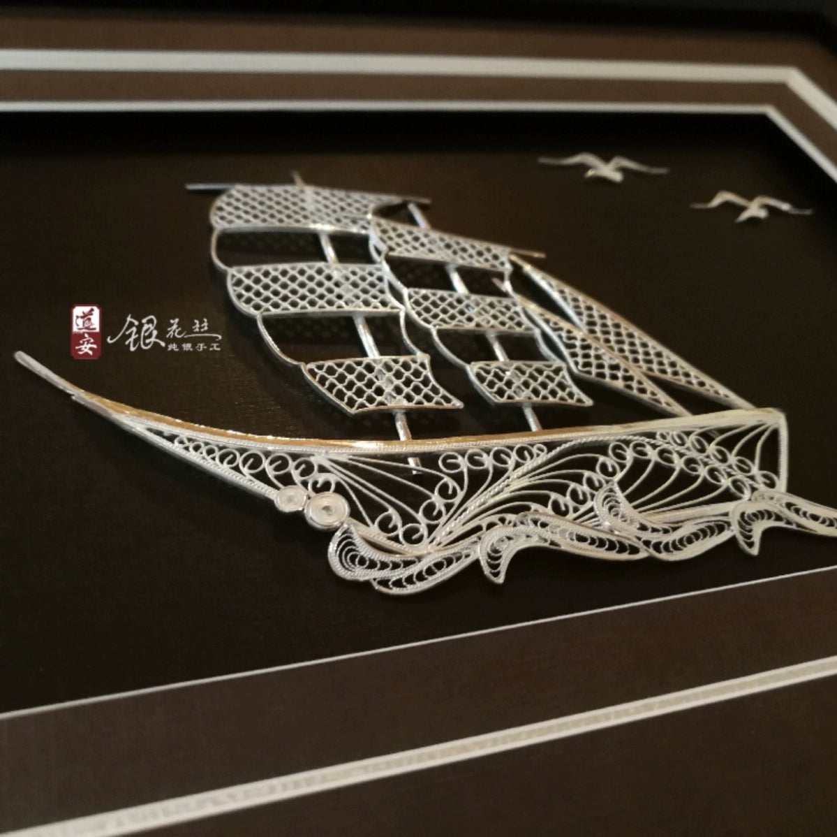 This silver silk painting featuring a sailboat is a remarkable creation of the Chengdu Daoan silver filament craft, a national intangible cultural heritage with a history spanning over 1,700 years. Originating from the Han Dynasty, this craft uses high - purity silver as its base material. The silver is drawn into delicate wires, which then undergo an array of intricate processes such as filling, stacking, threading, twisting, and welding. The unique "flat - filling wire" technique is deftly employed to carefully outline and fill the sailboat pattern on the silk.