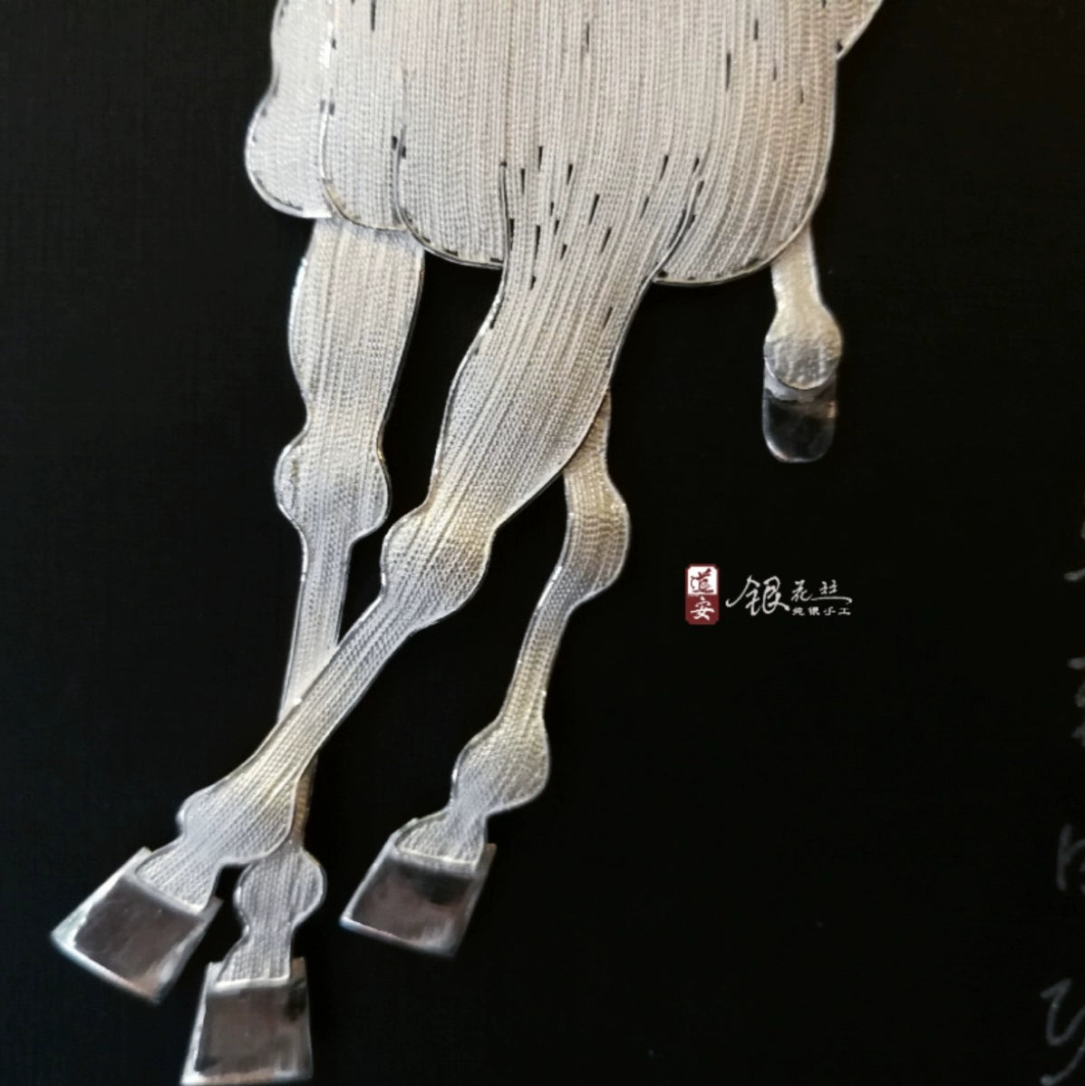 Dating back to the Shang and Zhou Dynasties, the Chengdu Dao'an silver filament craft has a history of over 2,000 years. It demands the use of high-purity S999 fine silver. The production process is highly intricate, involving melting, wire drawing, filling, stacking, threading, twisting, and high-temperature welding. The distinctive "flat filling wire" technique is utilized to meticulously outline and fill the single horse pattern, presenting a vivid and lifelike image of the horse.