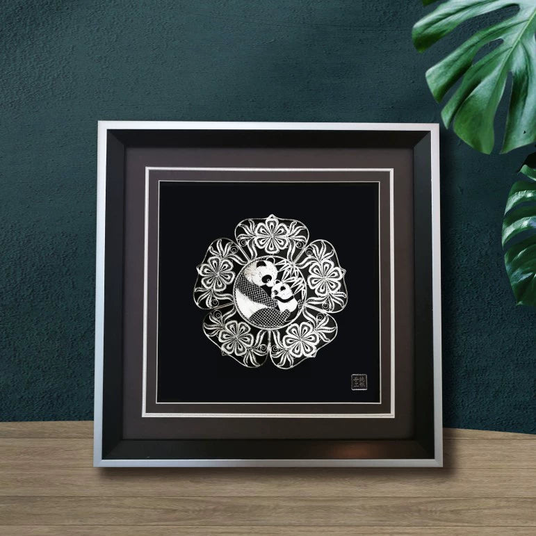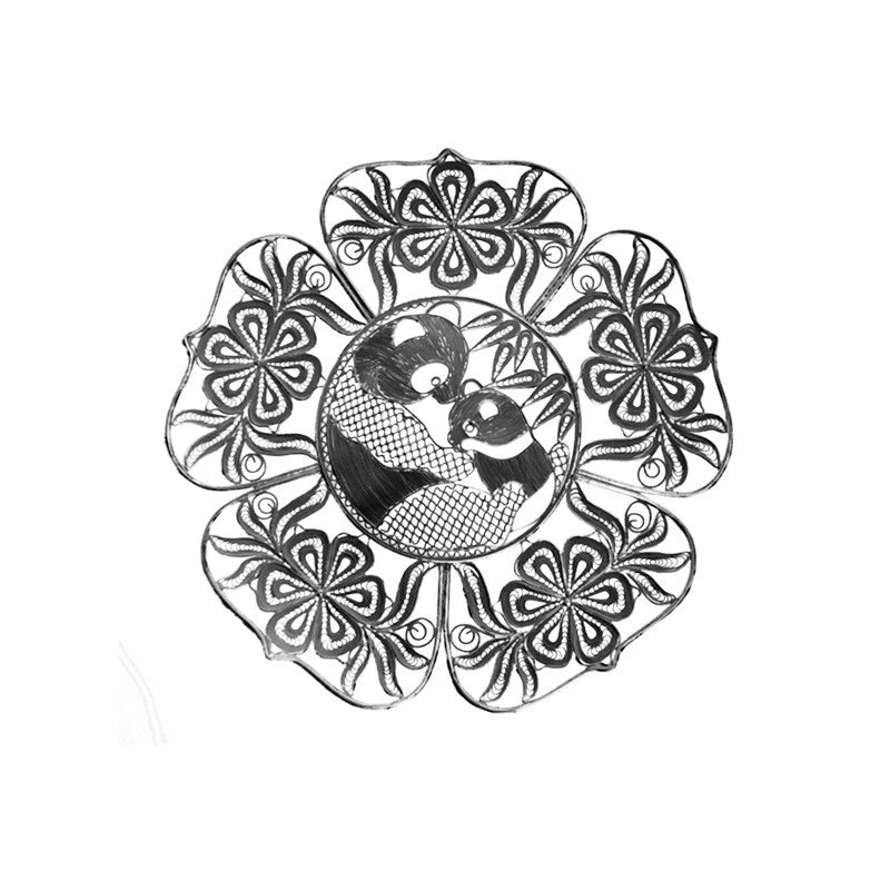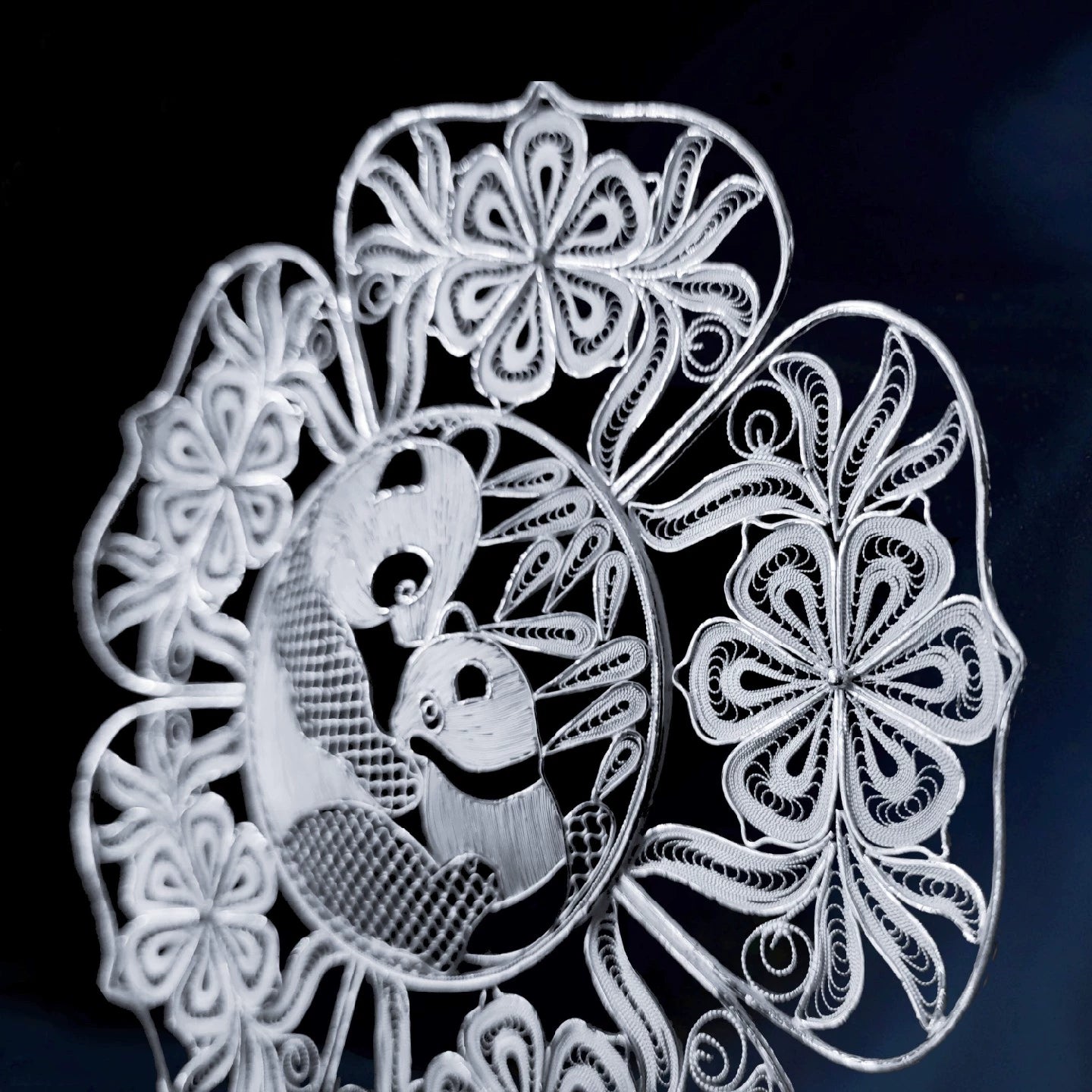 This sterling silver brushed filament ornament mother and son panda plate is a masterpiece of the Dao'an silver flower silk craft from Chengdu, Sichuan, which is a national intangible cultural heritage with a history of over 1,700 years.