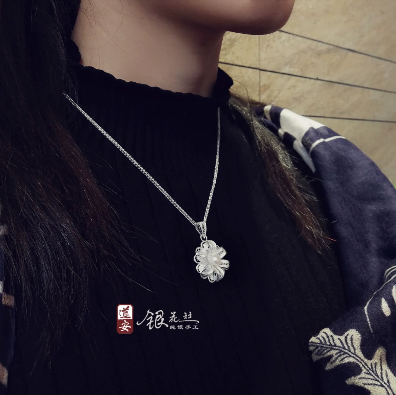 Skilled artisans draw high-purity silver into thin threads and use the techniques of filling, stacking, threading and twisting to create delicate patterns. Then, they inlay natural freshwater pearls, which shine with a soft and charming luster. The combination of silver flower silk and freshwater pearls presents a unique aesthetic feeling. This pendant is not only a beautiful accessory for various occasions such as banquets and parties, adding a touch of luxury and elegance, but also a precious collection item, carrying rich cultural connotations and historical value. It is a perfect combination of traditional craftsmanship and natural beauty, embodying the unique charm of Chinese intangible cultural heritage.