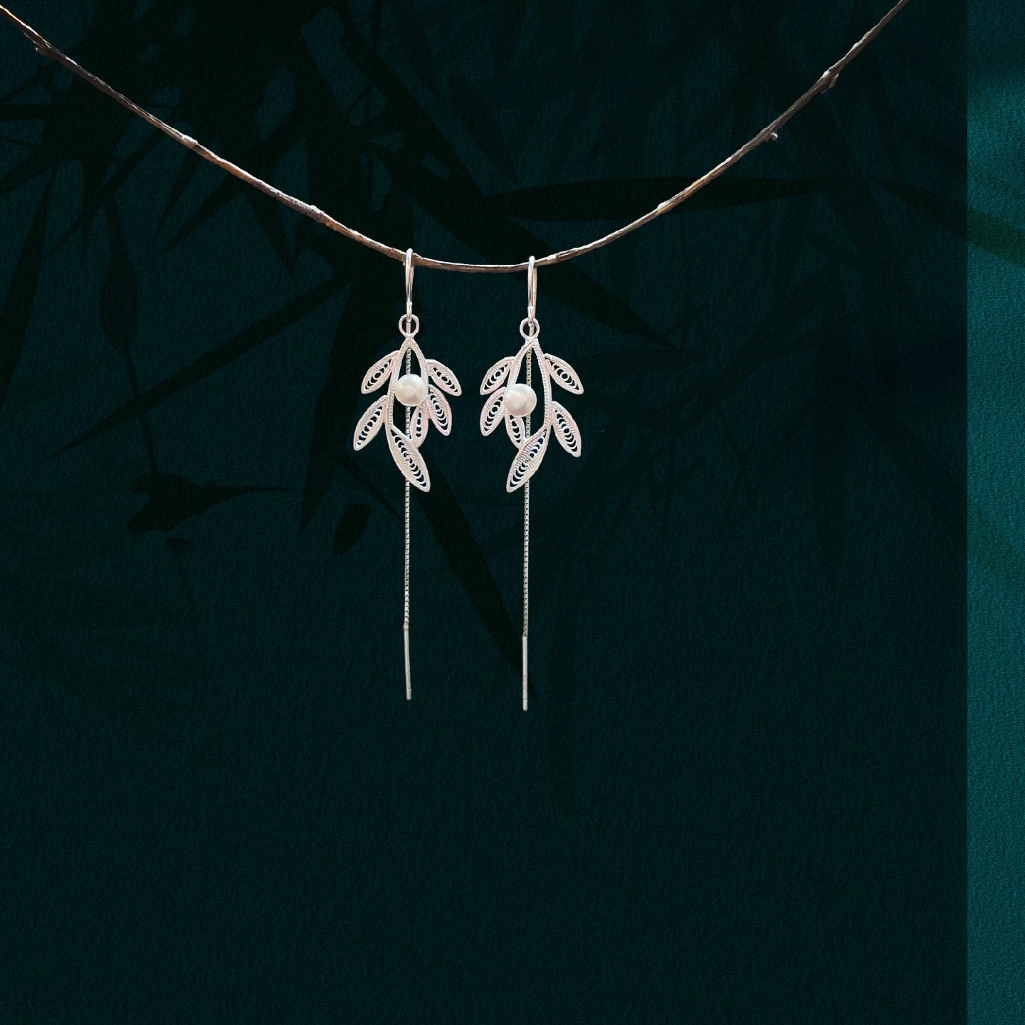 Handmade Sterling Silver Filigree Willow Leaf & Freshwater Pearl Earrings - Daoan Silver Filigree Craft