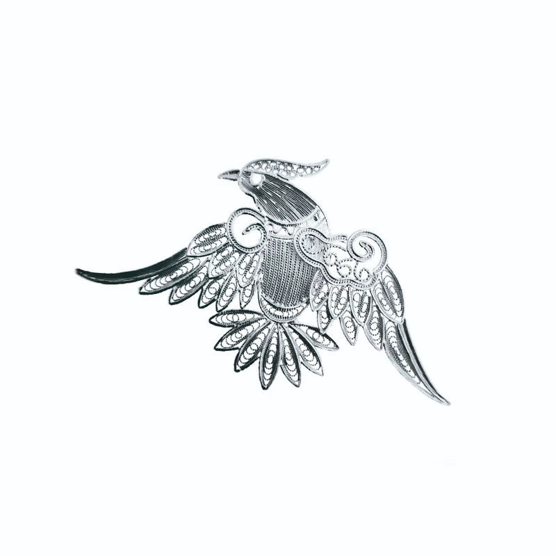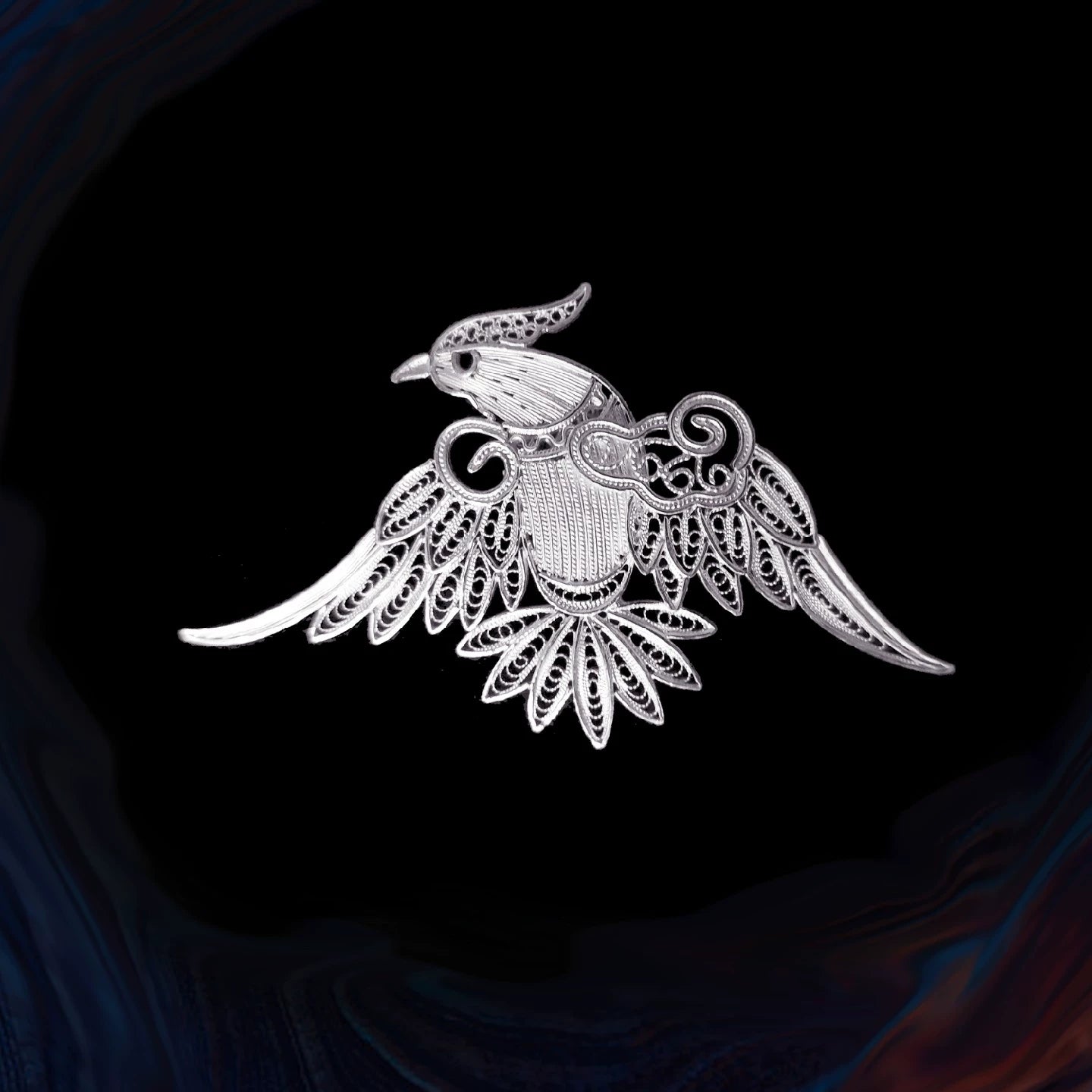 This Silver Flower Silk Sterling Silver Handmade Retro Ruyi Auspicious Bird Brooch is a masterpiece of intangible cultural heritage craftsmanship. Dating back thousands of years, the Silver Flower Silk technique is a traditional Chinese art with profound cultural roots. Skilled artisans painstakingly shape each brooch using pure silver threads, applying techniques like wire drawing, twisting and soldering. The retro ruyi and auspicious bird design is not only a symbol of good luck and prosperity but also a perfect combination of traditional culture and modern aesthetics. As an intangible cultural heritage gift and collectible item, this brooch is suitable for various occasions such as banquets, parties and festivals. It can be worn on clothing to add a touch of elegance and cultural charm, or collected as a precious work of art, carrying the unique value of cultural inheritance.